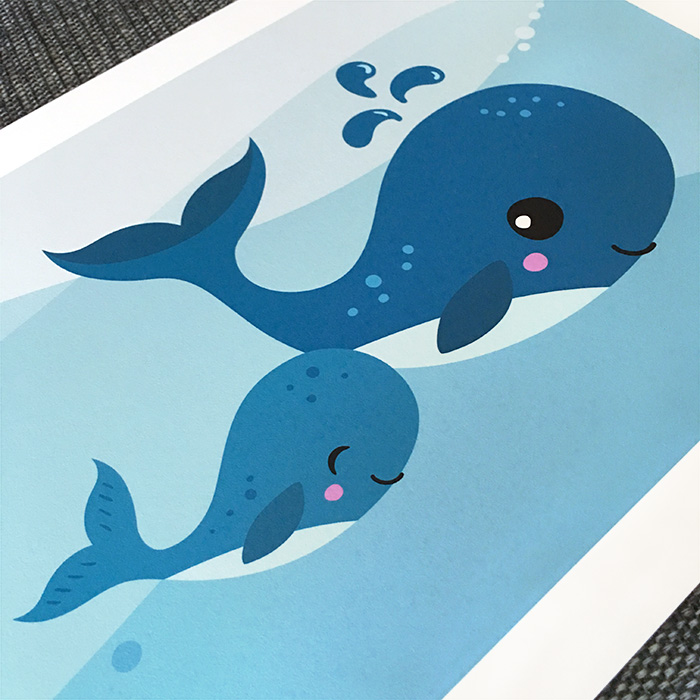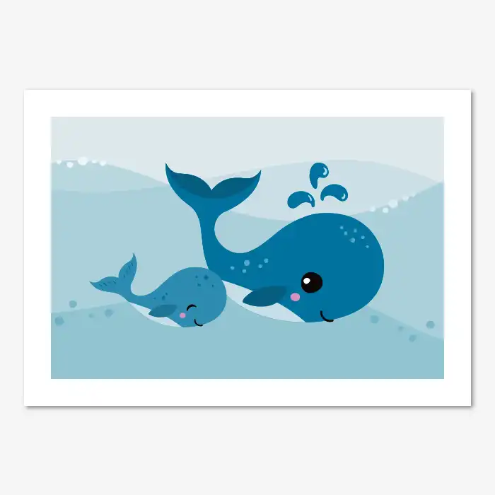 Barntavla med valar. Denna söta tavla för barn har en illustration föreställande två valar, en stor som simmar före och en liten som simmar efter den stora. Kanske är de mamma och barn eller syskon (storasyster/storebror och lillasyster/lillebror). Den stora valen blåser ut vatten genom sitt lufthål. Båda har rosiga kinder och en glad min. I bakgrunden ser man havet de simmar i med stora vågor och abstrakta, skummande vågtoppar. Runt tavlan finns en vit kant. Fin inredningsdetalj till barnrum eller lekhörna. Passar fint i ett rum med blå färger eller havstema.