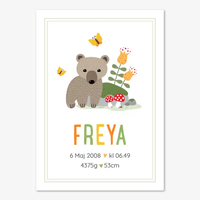 Söt doptavla eller namntavla med en liten björnunge som står bredvid en mossig sten. Framför stenen växer två flugsvampar och bakom två gula blommor. Bredvid den lilla björnen flyger två fjärilar. Personligt namn med gröna, gula och orangea bokstäver samt födelsedatum, klockslag, vikt och längd. Passar perfekt i barnrum med naturtema och är en uppskattad present till nyfödda, dop och namngivningar.