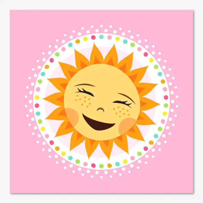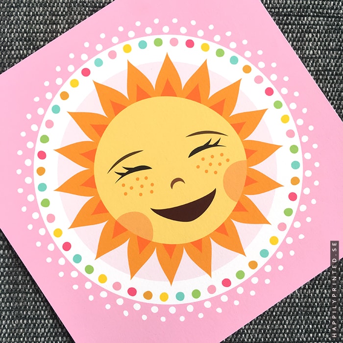 Fin barntavla föreställande en glad och söt liten sol med fräknar och rosiga kinder. Runt solen finns en kant av färgglada prickar i blå, gul, två nyanser av rosa, orange och grönt. Utanför dessa finns två rader a vita prickar mot en rosa bakgrund. Denna supersöta tavla blir en färgklick och lyser verkligen upp i barnrummet! Finns även med grön och turkosblå bakgrundsfärg.