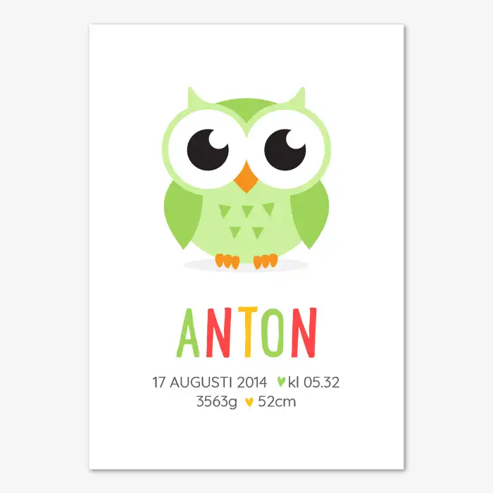 En fin födelsetavla med en illustration av en söt, grön liten uggla. Personligt anpassat namn i färgglada bokstäver (grön, röd, gul) samt födelsedatum, klockslag, vikt och längd på barnet. Denna tavla blir ett minne för livet och en fin present till en nybliven mamma eller pappa.