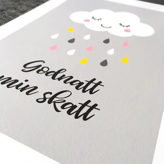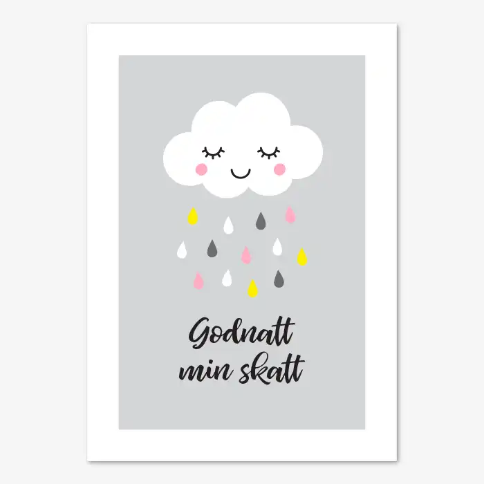 Fin poster för barn föreställande ett fluffigt, vitt litet moln som sover eller blundar. De slutna ögonen har långa ögonfransar och molnet har rosiga, rosa kinder. Nedanför faller regndroppar i flera färger, vitt, rosa, gult och mörkare grått . Bakgrunden är ljusgrå med vit kant. Under dropparna i den nedre delen av tavlan står texten “Godnatt min skatt” i elegant skrivstil. Perfekt barntavla att ha på väggen vid barnets säng då den har ett roligt och lugnande motiv som barnet kan titta på. Önskar du denna tavla men med en annan text eller färg, kontakta kundtjänst före din beställning så ska vi försöka ordna det.