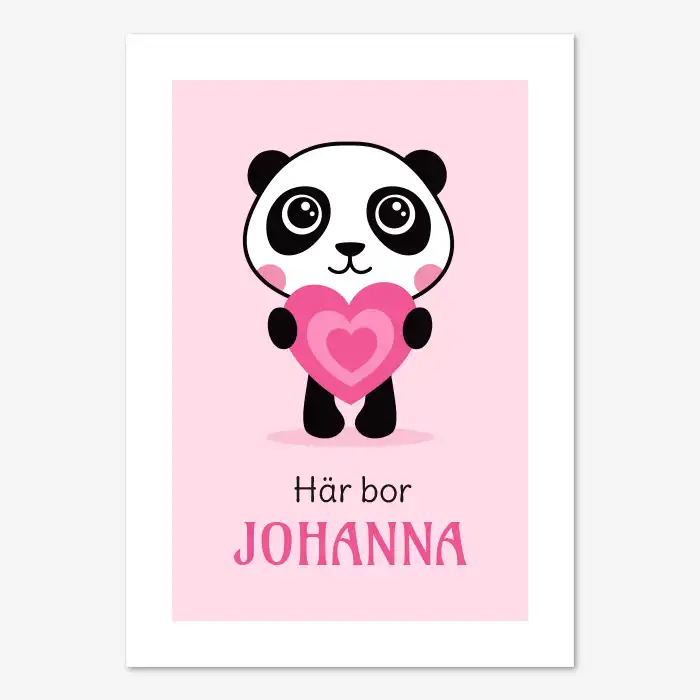 Söt barnposter föreställande en liten panda med stora, glittrande ögon som varsamt håller ett rosa hjärta i famnen. Pandan är svartvit med rosiga kinder och en liten nos. Ljusrosa bakgrund med en vit kant. Under illustrationen finns texten “Här bor” följt av ett anpassningsbart namn i rosa. Söt tavla för barn som blir en färgklick i barnrummet.