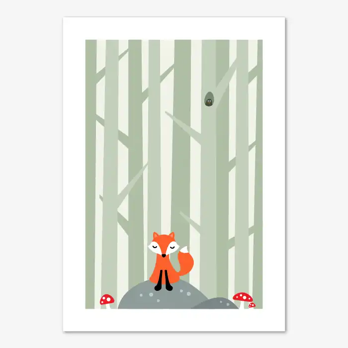 Tavla för barn med fint djurmotiv föreställande en söt liten räv med slutna ögon som sitter på en sten mitt i skogen. Stenen är grå och runt om räven och stenen växer det röda och vita svampar (flugsvampar). I bakgrunden kan man se rader av trädstammar som siluetter mot en ljusare bakgrund och i ett träd sitter en söt liten fågelunge och kikar ut från sitt fågelbo i ett hål i trädet. Mjuka, neutrala färgtoner med en färgglad klick av röd och orange. Denna barntavla passar bra som väggdekor i barnrum eller lekrum. Perfekt för dig som älskar sagokänsla, skandinavisk minimalism och naturinspirerad inredning.