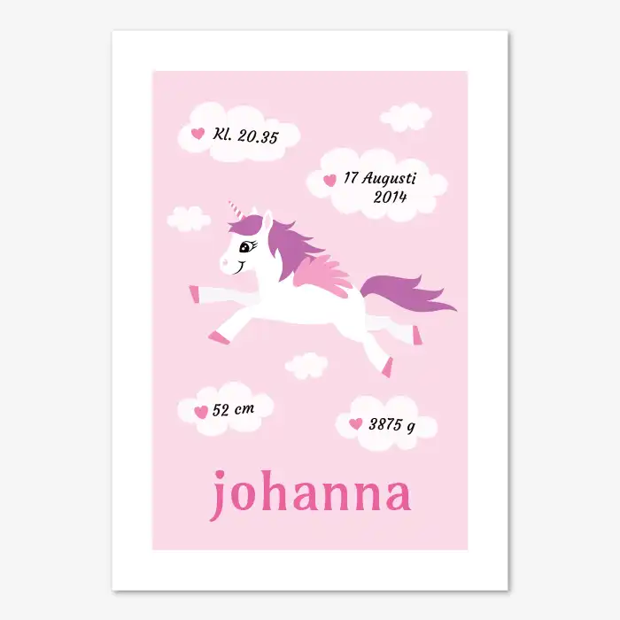Denna doptavla (namntavla/födelsetavla) har en illustration av en liten enhörning med lila man och svans som flyger bland vita moln på en rosa bakgrund. Personligt anpassat namn i rosa bokstäver samt födelsedatum, klockslag, vikt och längd utplacerat på molnen tillsammans med små hjärtan. Runt tavlan finns en vit kant. Fin som väggdekor i ett barnrum. Den personligt anpassade texten gör tavlan unik just för dig!