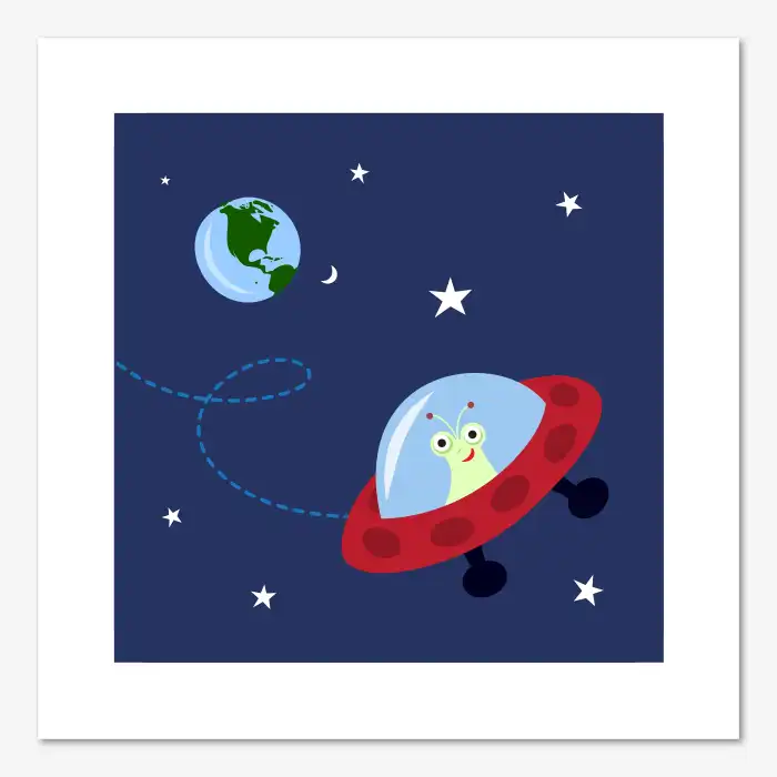 Denna barntavla föreställer en söt, grön liten utomjording med stora ögon, antenner och glad min som kör ett rymdskepp genom rymden. Rymdskeppet är runt som ett flygande tefat med röd kant och svarta landningsställ. I bakgrunden kan man se jorden med blå hav och gröna kontinenter samt månen och vita stjärnor mot en mörkblå bakgrund. Vit kant. Fint rymdmotiv som passar bra till alla barn som är intresserade av rymden, UFOn och utomjordingar. Rolig väggdekor till barnrum och lekrum. Kan tex kombineras med barntavlan “Pojke på mars med utomjordingar”